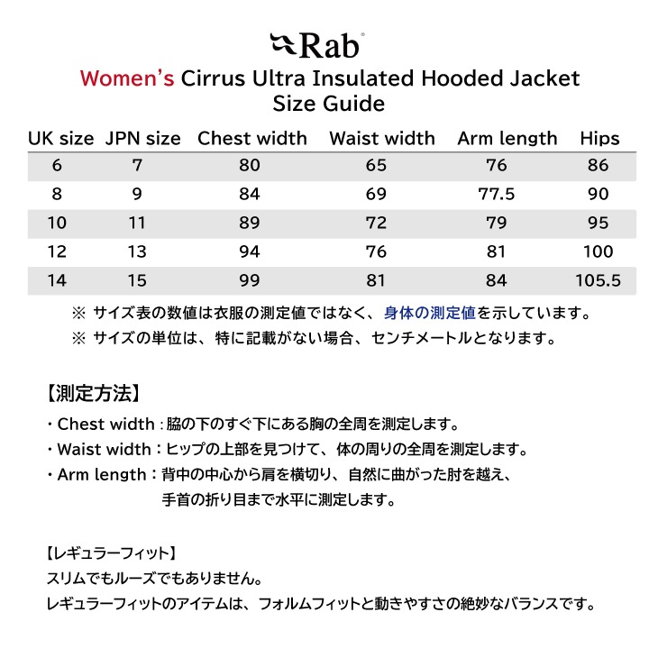 ※上の表は、衣服の測定値ではなく、身体の測定値を示しています。
