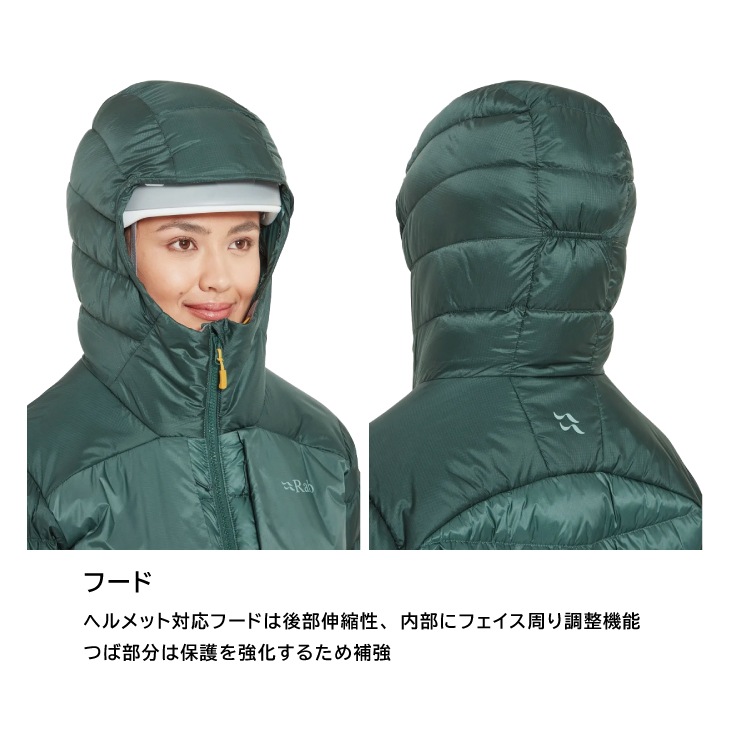 - ヘルメット対応フードは後部伸縮性、内部にフェイス調整機能、つば部分は保護を強化するため補強
