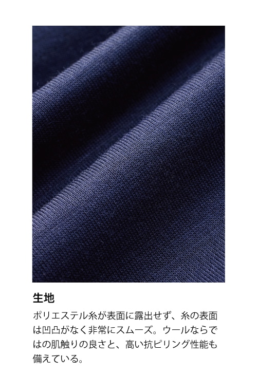 ポリエステル糸が表面に露出せず、糸の表面は凹凸がなく非常にスムーズ。ウールならではの肌触りの良さと、高い抗ピリング性能も備えている。