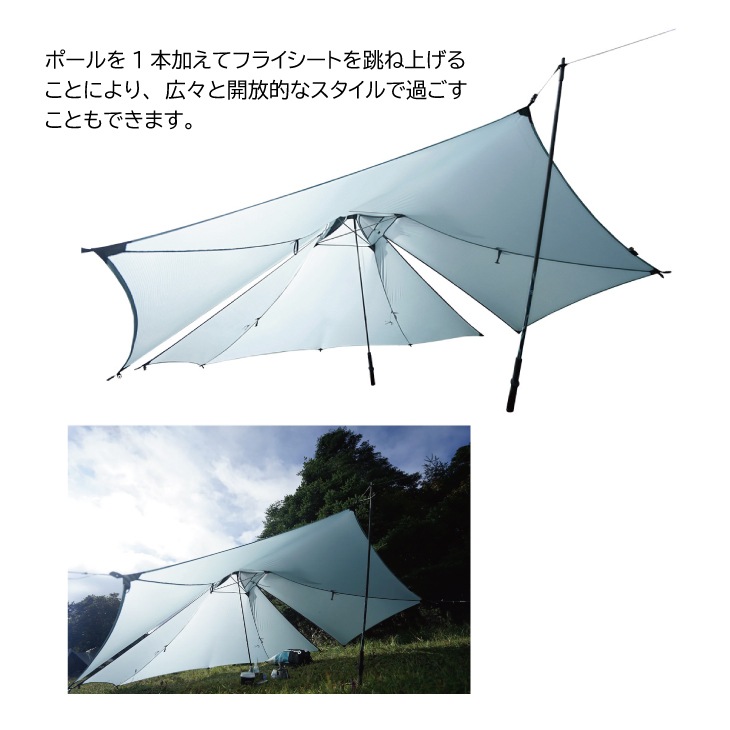 ポールを1本加えてフライシートを跳ね上げることにより、広々と開放的なスタイルで過ごすこともできます。