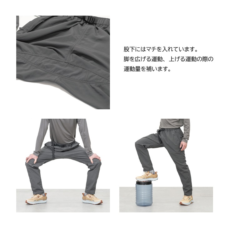 今回の『Basic Hike Pants』は、コットンライクなワッシャー加工を施したナイロン100%Supplex Nylon(サプレックスナイロン)を使用しています。