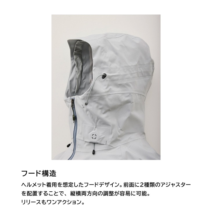 ヘルメット着用を想定したフードデザイン。前面に2種類のアジャスターを配置することで、縦横両方向の調整が容易に可能。リリースもワンアクション。