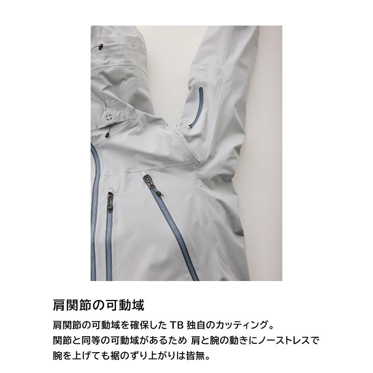 肩関節の可動域を確保したTB独自のカッティング。関節と同等の可動域があるため 肩と腕の動きにノーストレスで、腕を上げても裾のずり上がりは皆無。