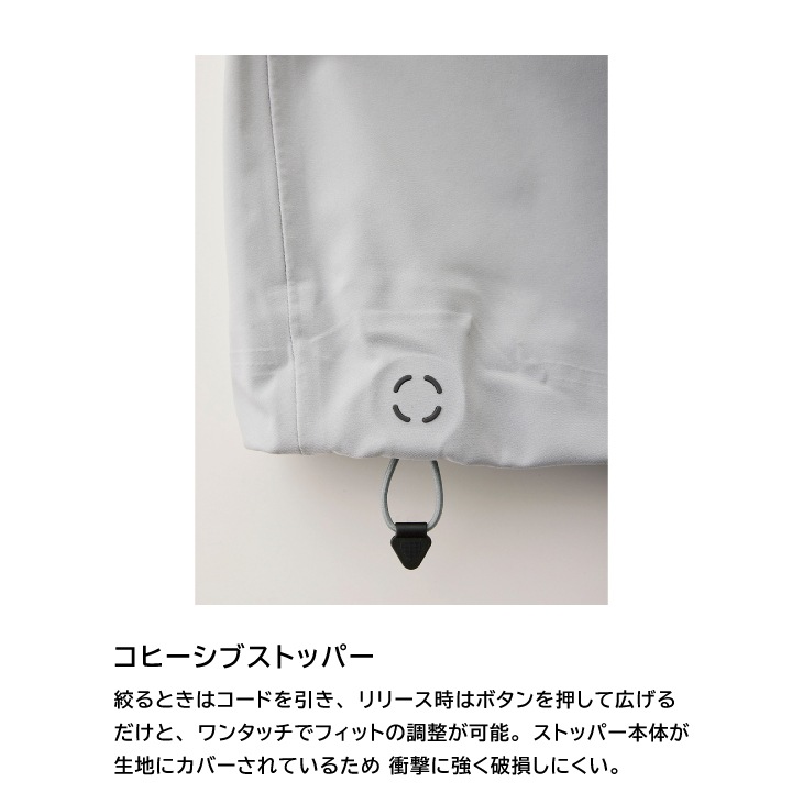 絞るときはコードを引き、リリース時はボタンを押して広げるだけと、ワンタッチでフィットの調整が可能。ストッパー本体が生地にカバーされているため 衝撃に強く破損しにくい。