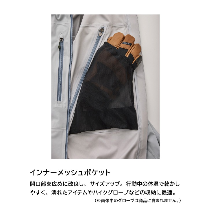 今季のアップデート。開口部を広めに改良し、サイズアップ。行動中の体温で乾かしやすく、濡れたアイテムやハイクグローブなどの収納に最適。