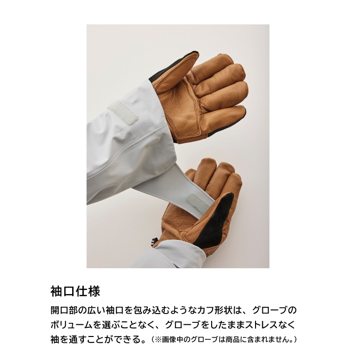 前面にアジャスターを集中させたフード、手首を包み込むように締まる袖口など、実際のフィールドで使い込んだからこそ生まれたディテールもまた大きな魅力です。