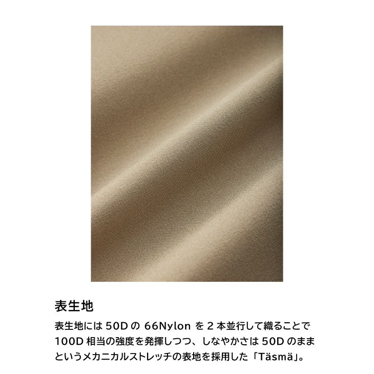 表生地には50デニールの 66 Nylon を2本並行して織ることで、100デニール相当の強度を発揮しつつ、しなやかさは50デニールのまま、というメカニカルストレッチの表地を採用した「Täsmä」。